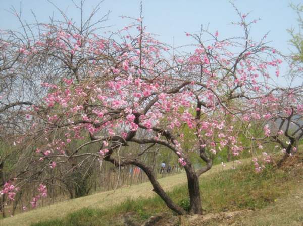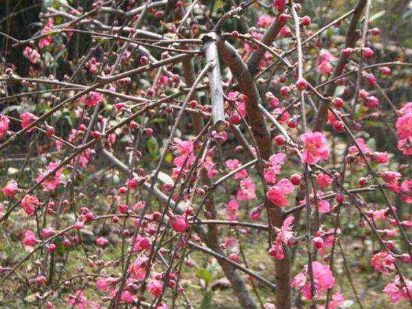 垂枝桃是桃花中枝姿最具韻味的一個類型,其小枝拱形下垂,樹冠猶如傘蓋。花開時節,宛如花簾一瀉而下,蔚為壯觀。無論是孤植于庭院,還是群植,都有很好的觀賞效果,可作為公園、小區等地的景觀樹或行道樹。