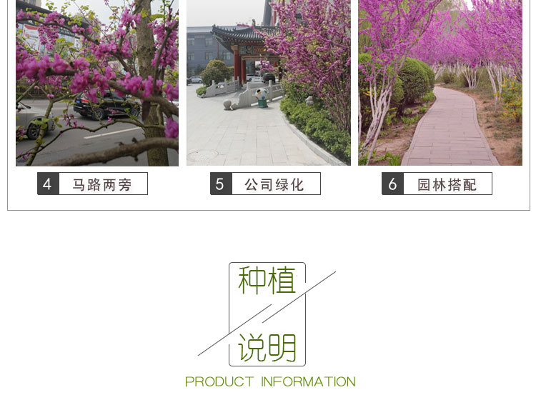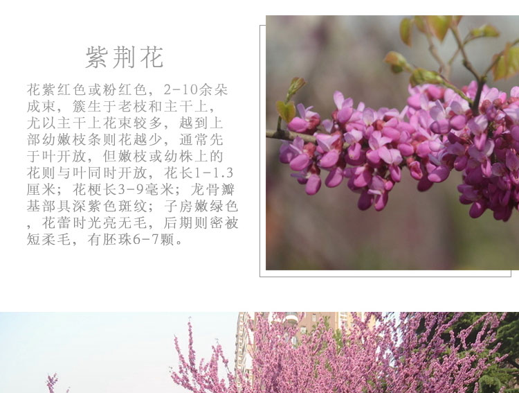 叢生紫荊先花后葉,花形如蝶,滿樹皆紅,艷麗可愛,葉片心形,多叢植于草坪邊緣和建筑物旁,園路角隅或樹林邊緣。因開花時,葉尚未發出,故宜與常綠之松柏配植為前景或植于淺色的物體前面,如白粉墻之前或巖石旁。